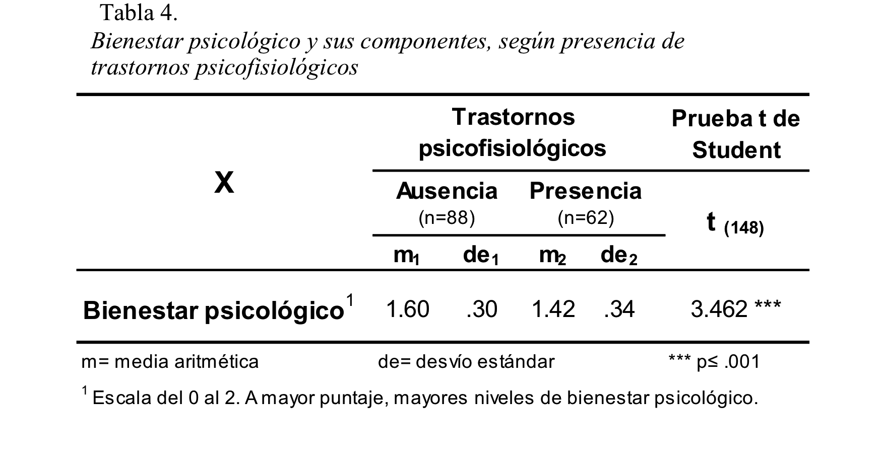 En la tabla 4 se presentan las medias y desvíos estándares de los puntajes totales del Índice de Bienestar Psicológico para aquellos que manifestaron ausencia y presencia de trastornos psicofisiológicos, así como los resultados de la Prueba t de Student para comparar ambos grupos. Se observa en términos globales (considerando todos los ítems del índice con sus respectivas subescalas) una diferencia estadísticamente significativa para el bienestar psicológico (t(148)=3.462; p=.001), indicando que aquellos que no desarrollaron trastornos psicofisiológicos presentan, con mayor probabilidad, puntajes más altos de bienestar psicológico que aquellos que enfermaron (m1=1.60 de1=.30 vs. m2=1.42 de2=.34).