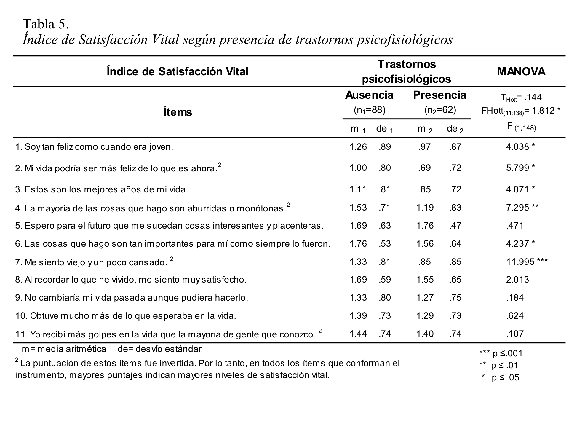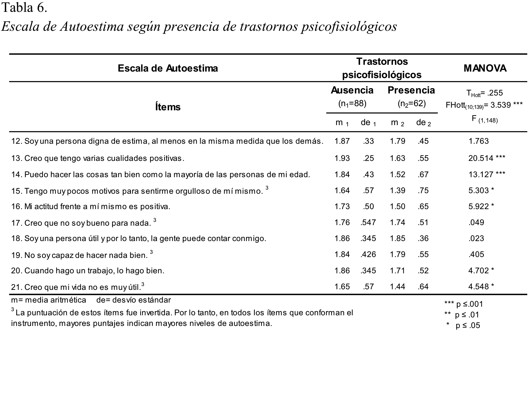 En las tablas 5 y 6 se consignan las medias y desvíos estándar de los puntajes obtenidos en el Índice de Satisfacción Vital y la Escala de Autoestima, respectivamente, para los subgrupos conformados por aquellos que manifestaron ausencia o presencia de trastornos psicofisiológicos. Asimismo, se consignan en cada tabla los resultados del análisis multivariado de la variancia (MANOVA), considerando los ítems que conforman dichos cuestionarios en forma conjunta y cada uno en forma particular.