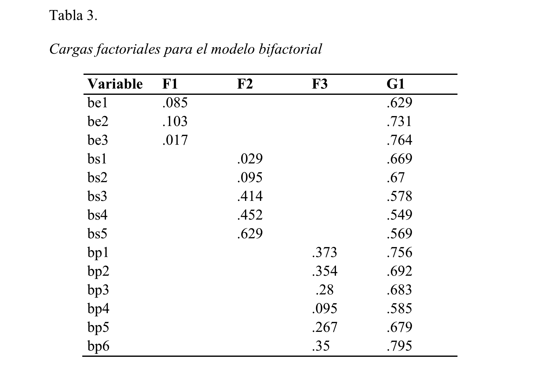 El análisis factorial exploratorio sugiere la presencia de un factor por lo que se considera evaluar un modelo bifactorial con tres dimensiones específicas y una general además de la estructura original de tres factores, tal como se presenta en la figura 1.