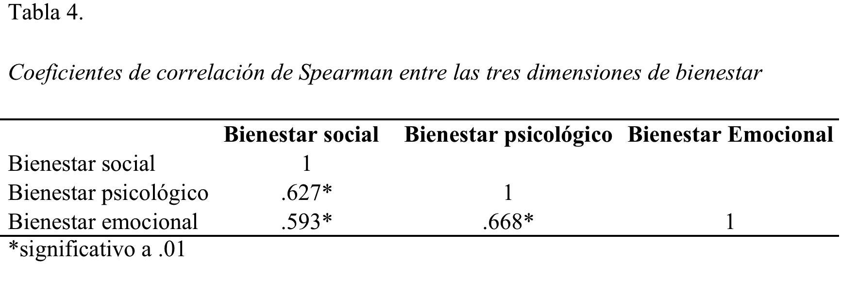 Se calcula el coeficiente de correlación de Spearman entre las 3 dimensiones de bienestar cuyos resultados se presentan en la tabla 4.