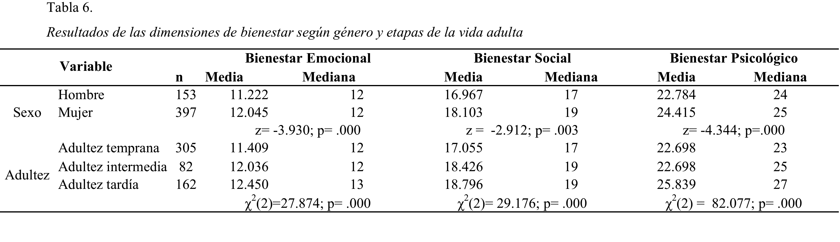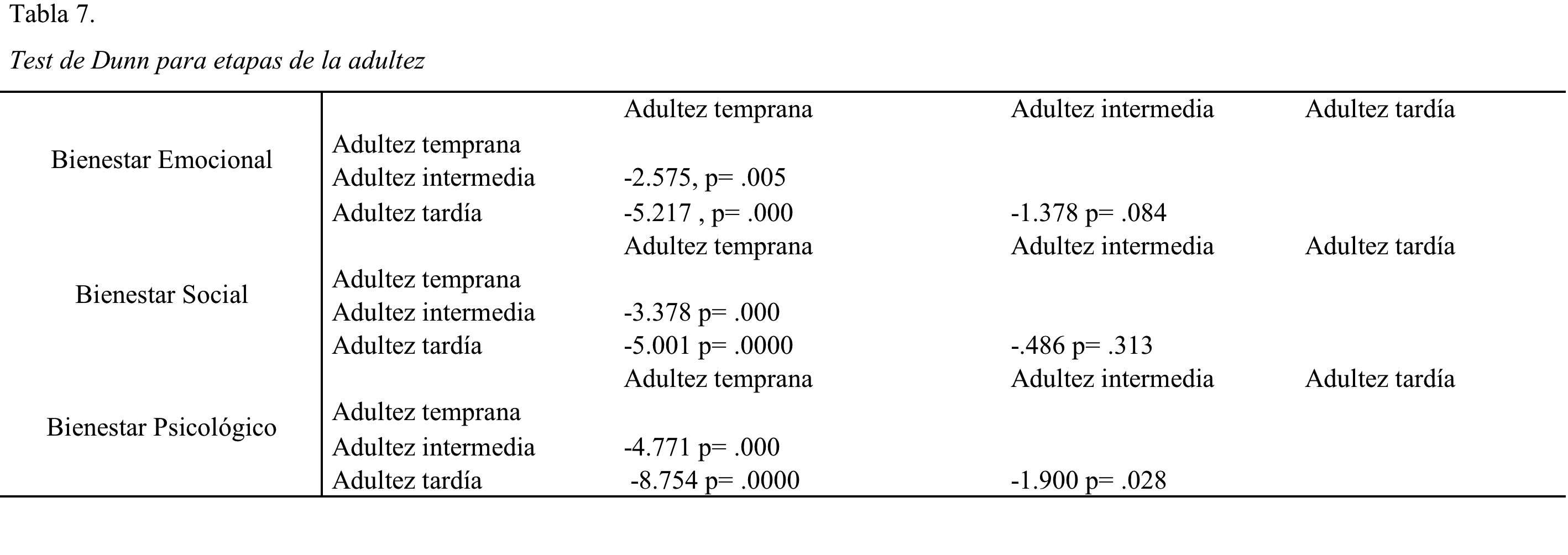 Cuando se analizan los resultados de los individuos clasificados por edad (adultez temprana, adultez media y adultez tardía) para cada dimensión de bienestar se observa que la población en adultez tardía registra valores promedio más alto. La prueba de Kruskal-Wallis muestra que en las tres dimensiones de bienestar existe una diferencia estadísticamente significativa entre al menos un par de categorías. Mediante la prueba de Dunn se evidencia que en cuanto al bienestar emocional, la diferencia entre el valor mediano entre el grupo de adultez tardía y adultez temprana; y adultez tardía y adultez media es estadísticamente significativa, no así la diferencia existente entre adultez temprana y adultez media. Los mismos resultados se observan en la sección de bienestar social, mientras que en el bienestar psicológico se observa que todas las diferencias entre todas las categorías son estadísticamente significativas.