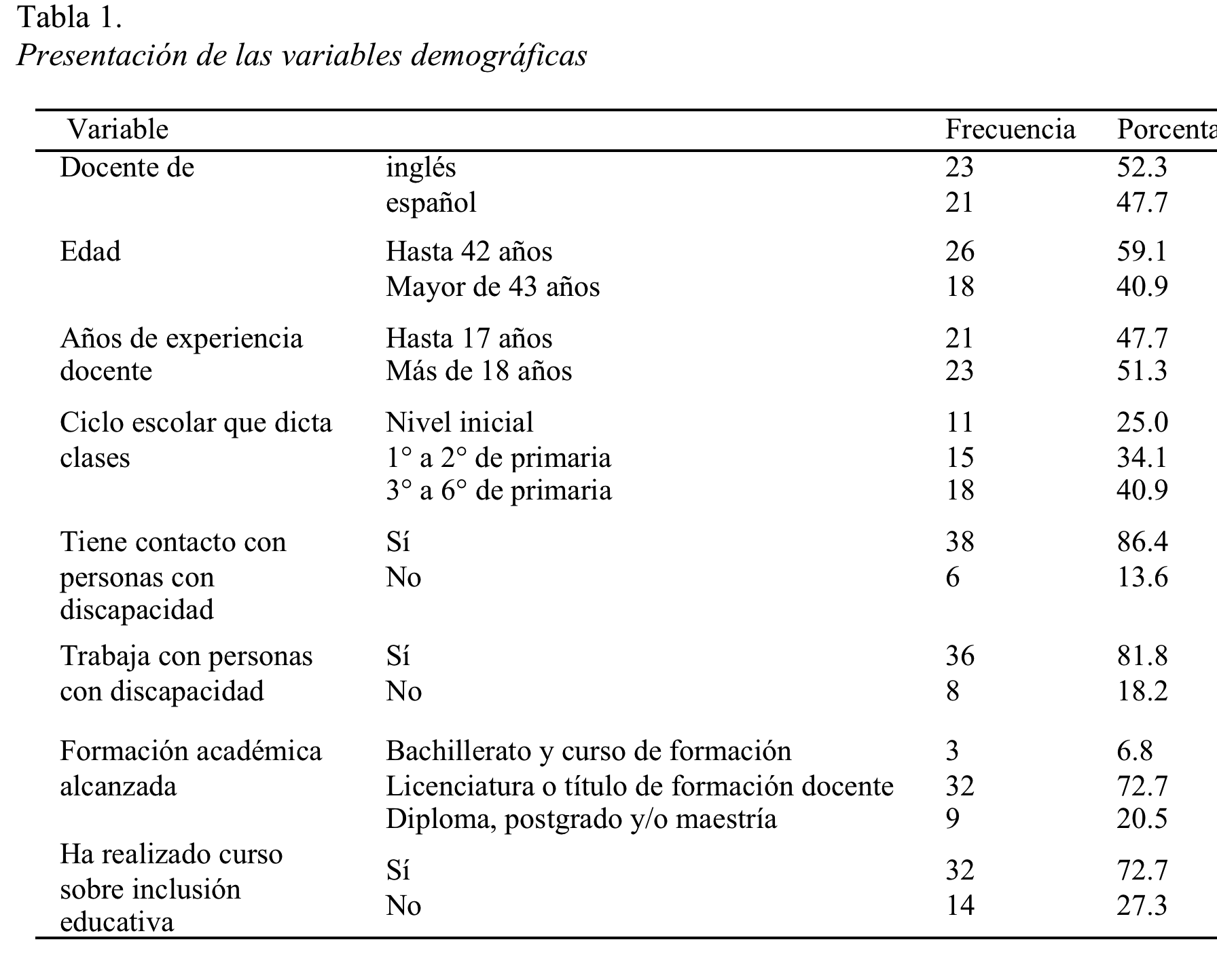 Mediante un muestreo no probabilístico de tipo intencional, se aplicó la encuesta de carácter voluntario a todos los docentes de inglés y de español de enseñanza primaria e inicial de una institución privada de Montevideo. Se obtuvo un total de 44 participantes; en la tabla 1 se muestran frecuencias y porcentajes de las variables socio-demográficas.