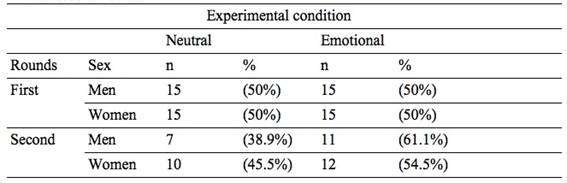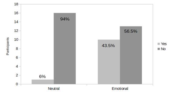 The participants were 60 undergraduate students (50% men), ranging from 18 to 35 years of age (Mage = 22,32; s.d. = 3.58), from Petrolina City in Pernambuco State and Juazeiro City in Bahia State in Brazil. They were predominantly middle class and white, and consented to participate spontaneously of this study. The participants were randomly assigned to one of the two experimental conditions: a “neutral” (n = 30) or an “emotional” (n = 30).