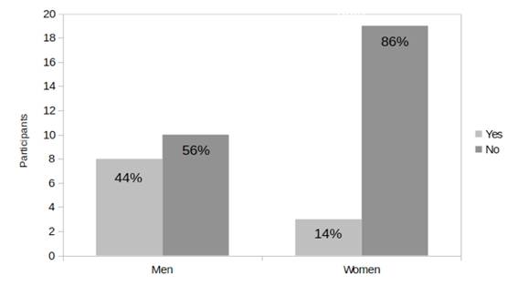 Women decided more often to participate in the first round of the gambling game than men did, regardless of the experimental condition. However, the Chi-square test did not indicate any difference in the proportion between women and men for the first round. On the other hand, when the frequency of gambling was analyzed, only for the second-round-gamblers, the Chi-square test indicated differences in proportions between men and women who risked their last ticket (χ²=4.7; d.f. =1; p=.03). As shown in Figure 2, more men (44%) than women (14%) agreed to participate in the second round of gambling. In this latter analysis, only those who took part in the first round and decided to gamble again were considered.