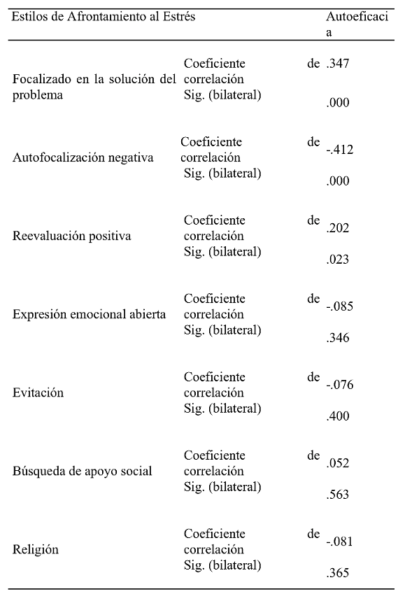 Se calculó el coeficiente Rho de Spearman hallándose una moderada asociación positiva significativa entre el nivel de Autoeficacia de los participantes y el Estilo de Afrontamiento al Estrés denominado Focalizado en la solución del problema (ρ = .347; p = .000). Dicho resultado indica que cuanto mejores y más adecuados sean los juicios sobre las propias capacidades subjetivas, los estudiantes aplicarán un Estilo de Afrontamiento que implica el análisis de las causas del problema y el planeamiento y ejecución de soluciones para afrontar las situaciones estresantes.