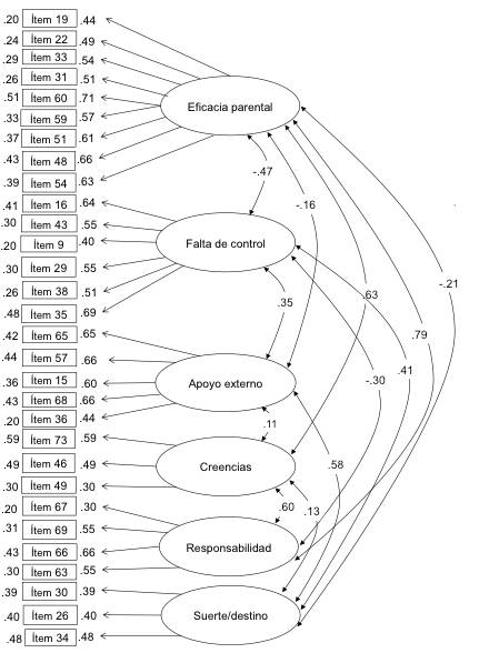 Se observan correlaciones moderadas estadísticamente significativas entre los factores, con lo que se confirma su pertenencia al constructo. Las correlaciones de mayor peso fueron las de eficacia parental con responsabilidad (0.79) y creencias (0.63), y la de creencias con responsabilidad (0.60). Las dos primeras de locus de control interno y la tercera de locus de control externo.