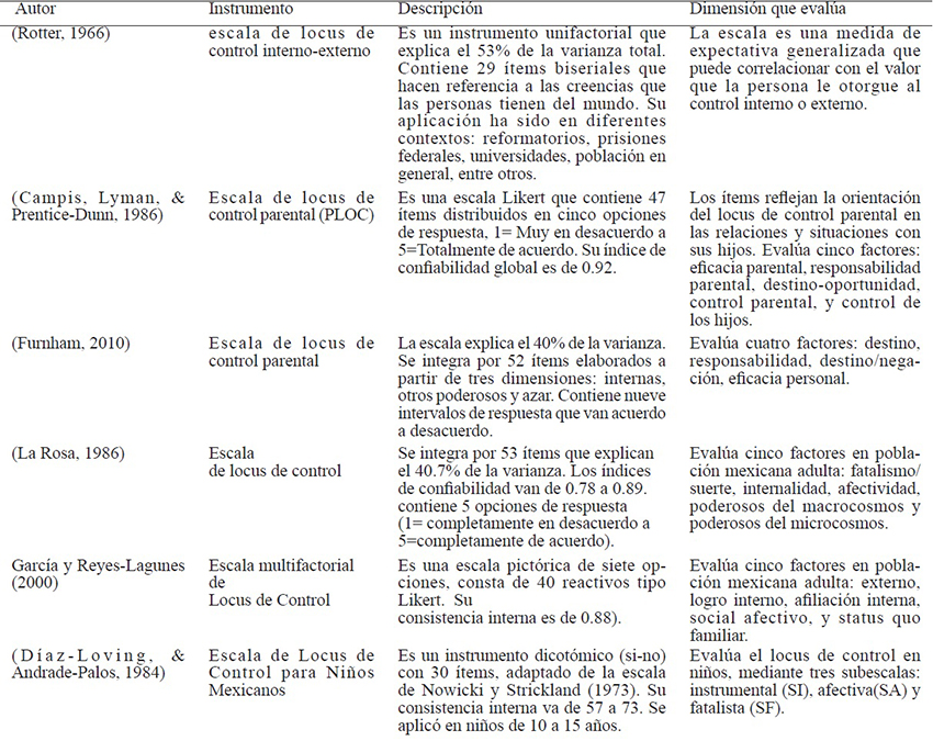 Con relación a los instrumentos para evaluar el locus de control, en la Tabla 1 se presentan seis, uno evalúa el locus de control general, dos el locus de control parental, tres evalúan el locus de control en población mexicana a partir de diferentes dimensiones.