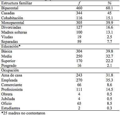 La muestra fue no probabilística por conveniencia, conformada por 765 mamás de la ciudad de México, 460 (60.1%) biparentales (casadas o en cohabitación) y 305 (39.9%) monoparentales (divorciadas, madres solteras, viudas o separadas) con un rango de edad de 26 a 64 años (Medad = 42; DT = 6.66), todas con al menos un hijo adolescente con edad de 12 a 17 años. A nivel nacional, la encuesta intercensal (Instituto Nacional de Estadística, Geografía e Informática [INEGI], 2015) indica que el 29% del total de los hogares son dirigidos por una mujer, lo que significa que la jefatura femenina aumentó 4 puntos porcentuales entre 2010 (24.6%) y 2015 (29%). De manera específica, en la ciudad de México, el 36% de los hogares es dirigido por mujeres.