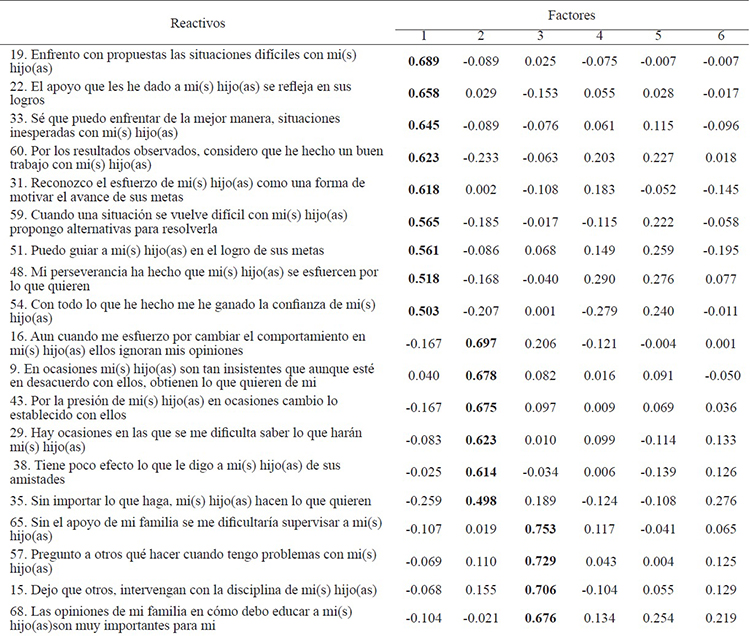 Resultado de estos criterios, quedaron 61 reactivos a los que se les realizó un análisis factorial exploratorio de componentes principales con rotación ortogonal. Se utilizó este análisis con la finalidad de identificar el número y composición de los factores necesarios para explicar la varianza común del conjunto de ítems de la escala (Lloret-Segura, Ferreres-Traver, Hernández-Baeza, & Tomás-Marco, 2014). El criterio que se siguió para considerar un ítem como parte de un factor fue que tuviera un peso factorial > 0.40 y que no compartiera peso factorial en otro factor. Los pesos factoriales indican el grado de correspondencia entre el ítem y el factor, cargas altas indican que el ítem es representativo para el factor, por lo que es deseable que cada ítem tenga peso solo en un factor, y se considera que valores de 0,40 son razonable (Montoya, 2007). Resultado del análisis, la escala quedó integrada por 30 reactivos distribuidos en seis factores (Tabla 3) Tabla 3 Continuación, que explican el 51.60% de la varianza con un alpha de Cronbach global de 0.736.