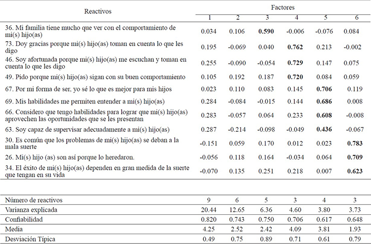 El factor 5, responsabilidad se refiere a la capacidad personal de las mamás para actuar de acuerdo a lo que consideran como lo mejor para la educación y el logro de las metas de sus hijos. Los ítems hacen referencia a las habilidades de las mamás y a su forma de ser. El factor 6, suerte/destino, describe la percepción de las madres de que la forma de ser de sus hijos se debe a la casualidad o al azar, sin asociarlo a sus acciones.