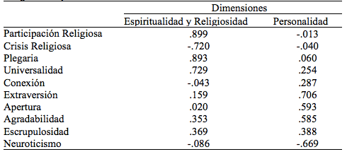 En la Tabla 1 pueden observarse la distribución de los pesos de las dimensiones en los factores “Espiritualidad y Religiosidad y Personalidad”.