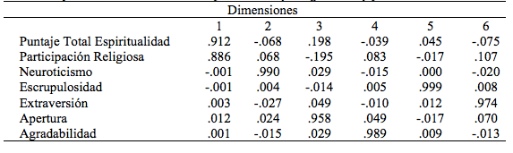 Se solicitó la extracción de seis factores; partiendo del supuesto de que por un lado se pesarían la espiritualidad (considerando en este caso el puntaje total de espiritualidad) y los aspectos vinculados a la participación religiosa y en los cinco factores restantes se distribuirían las cinco dimensiones de la personalidad evaluadas por el NEO PI R.