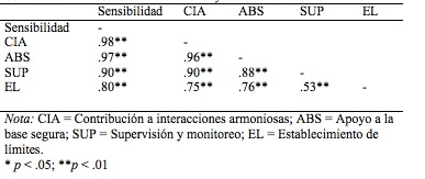 Respecto de la sensibilidad de las 16 figuras cuidadoras, se encontró un índice promedio de .43 (DE=0.44, Min=-.63, Max=.77, IC 95% = [.20, .67]) entre los puntajes promedio de las participantes y el criterio de sensibilidad de la escala MBPQS, índice que se ubica dentro de los rangos encontrados en otros países latinoamericanos (e.g., Posada et al., 2016). En cuanto a la consistencia de la conducta de la figura cuidadora, se hallaron correlaciones altas y muy altas entre la sensibilidad y sus cuatro dimensiones, y entre las dimensiones entre sí, como se puede observar en la Tabla 1; estas correlaciones son, además, estadísticamente significativas a un nivel de p<.01; la asociación más baja se registra entre Establecimiento de límites y Supervisión y monitoreo (r=.53).