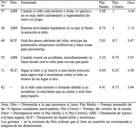 Según se puede observar, dos de los seis ítems, pertenecientes a la dimensión de Apoyo a la base segura, recibieron un puntaje mayor que el de la escala, en tanto que los otros tres ítems (uno de Apoyo a la base segura y dos de Supervisión y monitoreo), recibieron un puntaje menor. El análisis del enunciado de estos ítems permite inferir que en el grupo de figuras cuidadoras participantes existe, en general, una disposición mayor a la normada en la escala para realizar actividades en base a lo que le llama la atención al niño, mientras que por otro lado, presentan, de manera general, una tendencia menor a la del criterio para calmar al niño y prevenir situaciones conflictivas.