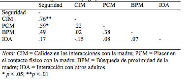 En cuanto a la seguridad del apego de los niños, se encontró un nivel ligeramente más elevado que los reportados en otros estudios latinoamericanos; adicionalmente, se halló correlación alta entre seguridad y calidez en las interacciones con la madre, correlación moderada con placer en el contacto físico con ella y con búsqueda de su proximidad, relativa independencia entre seguridad e interacción con otros adultos, posiblemente por el respeto y la distancia que caracteriza la relación de los niños con las personas mayores en los contextos latinos, como han planteado estudios previos.