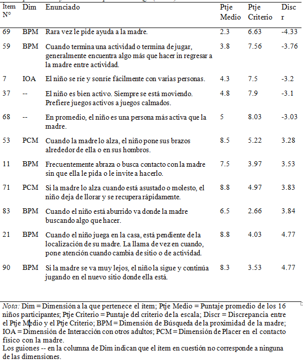 Cinco de estos 11 ítems (dos de la dimensión de Búsqueda de la proximidad de la madre, uno de la dimensión de Interacción con otros adultos, y dos que no pertenecen a ninguna de las dimensiones) recibieron un puntaje menor que el criterio de la escala, en tanto que los otros seis ítems (dos de Placer en el contacto físico con la madre y cuatro de Búsqueda de la proximidad de la madre) recibieron un puntaje mayor. El análisis de estos ítems permite deducir que el grupo de niños participantes se muestra más tímido, más dependiente de la madre y con más búsqueda de su proximidad y contacto que lo normado en la escala, lo cual podría estar relacionado con factores culturales.