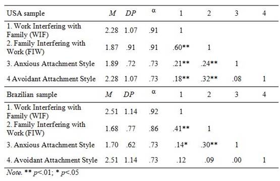 For Brazilian participants, the avoidant attachment pattern did not obtain a significant level of correlation with any variable. Although, anxious attachment was related to Work Interfering with Family (r=.14) and Family Interfering with Work (r=.30).