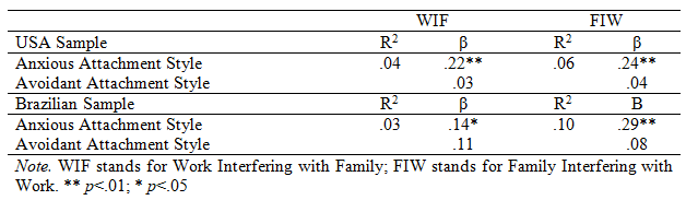 Note that the four tested models were significant, a fact that demonstrates the predictability of the attachment model in explaining the dimensions of work-family conflict [In the Brazil sample: FWIF(2,239) = 5,80, p>0,001 and FFIW(2,400) = 7,35, p<0,001; In the USA sample: FWIF(2,277) = 4,74, p>0,001 and FFIW(2,770) = 7,84, p<0,001]. The totals of variances that occurred in the four models were inferior to 10%. In the Brazilian and American samples, the Work Interfering with Family and Family Interfering with Work constructs were predicted by the anxious attachment pattern, and the avoidant attachment pattern was not predictive of any of these models. The Brazilian sample presented similar results, showing differences only in regression coefficients and total explained variances, as can be seen in Table 2.