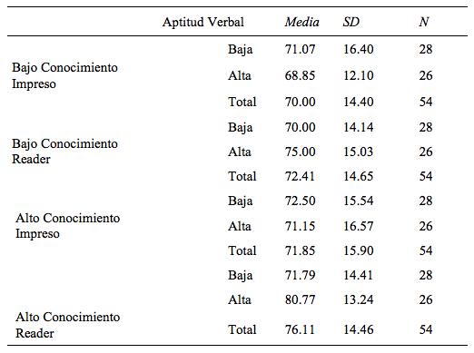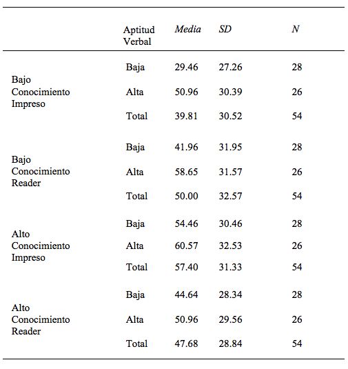 Respecto de la aptitud verbal (considerando los grupos extremos dentro de una muestra universitaria), como era esperable tuvo efectos significativos por sí sola, en la comprensión (Cortada de Kohan, 2004; Graesser et al., 2005). Además, específicamente en cuanto su relación con el soporte, los lectores de alta aptitud verbal armaron una Base de Texto más completa con el Reader que con el texto impreso. Esto significaría que los lectores con alta aptitud verbal pueden lograr un mejor rendimiento lector con un dispositivo más novedoso.