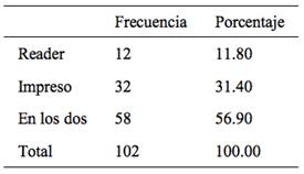 Del total de la muestra, solo el 4.90% (5 personas) poseían Reader, y un 16.70% una tablet. El 95 % que no tenía Reader afirmó al comienzo del estudio que no deseaba poseerlo porque no les interesaba o porque no se sentían cómodos. Al finalizar la tarea experimental, la opinión de los participantes varió en forma favorable por la experiencia de uso. Se consideró mayoritariamente (40%) un complemento del texto impreso y en forma similar, que no era ni mejor ni peor que leer en impreso (22%) o era mejor que leer en pantalla (21%). Minoritariamente consideraron al Reader como peor que leer un libro impreso (9%) o un complemento de la pantalla (4%), mejor que el impreso (2%), peor leer en pantalla (1%) o no sabían qué responder (1%).