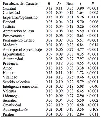 De las 24 regresiones apenas la fortaleza de Autorregulación no fue significativa. En las 23 fortalezas restantes los coeficientes de determinación (R2 ) ajustado variaron de 0,02 (Inteligencia emocional) a 0,19 (Creatividad). Se observa también que 7 fortalezas fueron más bien predichas, a saber, Gratitud, Prudencia, Amor, Humor, Vitalidad, Sentido Colectivo y Creatividad. Además, la percepción de apoyo social representó 19% de la variancia explicada de la fortaleza Creatividad, 15% del Amor y 13% de la fortaleza Vitalidad. Para comprender mejor la contribución de las dimensiones de la EPSUS-IJ para la explicación de las fortalezas de carácter, es presentada la Tabla 2.
