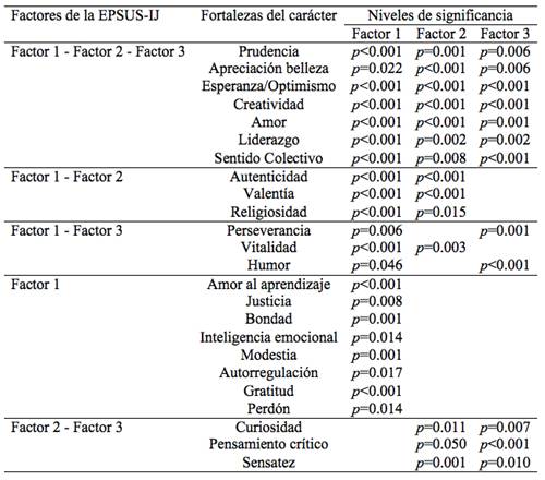 Los datos permiten identificar que el factor 1 (Enfrentamiento de Problemas) contribuyó significativamente en 21 fortalezas. Interacción Social, el segundo factor, presentó coeficientes significativos en 14 fortalezas, y el factor 3 (Afectividad) en 12 fortalezas.
