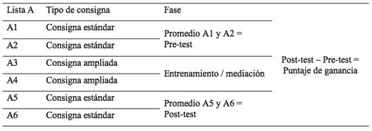 AVLT-PA (Calero & Navarro-González, 2006): versión modificada de la AVLT para evaluar potencial de aprendizaje. En esta versión, el evaluador introduce la mediación en los ítems intermedios de la lista, y se obtiene un puntaje de ganancia tras calcular la diferencia entre los promedios de los últimos intentos y los primeros intentos. El procedimiento de administración de la AVLT-PA se detalló previamente en la Tabla 1.