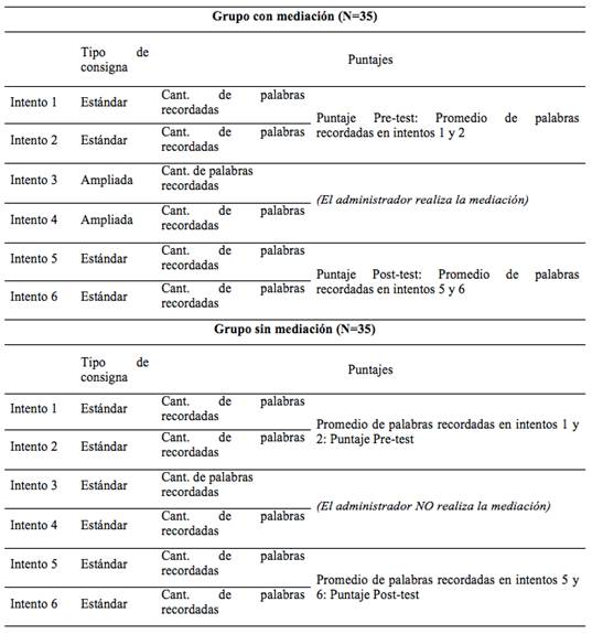 Los participantes fueron divididos aleatoriamente en dos grupos de 35 sujetos: un grupo recibió la mediación en los intentos A3 y A4 de la AVLT-PA, y el otro grupo no recibió ninguna mediación o entrenamiento en dichos intentos. Las diferencias en el procedimiento de aplicación de la AVLT-PA según los grupos se describen en la Tabla 2. Como se mencionó anteriormente, las consignas estándar consisten en la mera lectura de las palabras de la lista y el registro de las palabras recordadas por el sujeto, sin mayores intervenciones por parte del evaluador. Para las consignas ampliadas se siguieron los consignas de Calero y Navarro-González (2006), las cuales consisten, como se describió anteriormente, en la lectura de las palabras de la lista junto con una intervención activa del evaluador, aportando feedback de su rendimiento y un refuerzo en la lectura de las palabras que el sujeto aun no aprendió, registrando las palabras recordadas en cada intento.