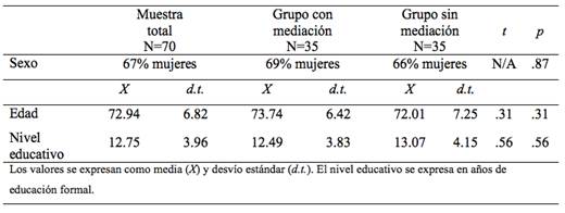 En la Tabla 3 se resumen las características sociodemográficas entre los grupos (con mediación y sin mediación), donde se observa que los mismos son homogéneos en términos de sexo, edad y nivel educativo.