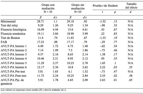 Surge del análisis de los resultados que las muestran estaban compuestas por sujetos homogéneos en términos de sexo, edad, nivel educativo y rendimiento cognitivo, y las únicas diferencias se dan justamente en los ítems donde se vislumbra el efecto de la mediación por parte del evaluador. De ello puede deducirse que la inclusión de este tipo de consignas ampliadas que plantea la evaluación dinámica es significativa a la hora de evaluar el rendimiento potencial de un sujeto. Los resultados sugieren que la mediación resultó efectiva para mejorar el aprendizaje de una lista de palabras, ya que los valores muestran diferencias en la cantidad de palabras recordadas posterior a la mediación (post-test) pero no antes de la misma (pre-test). Esto resulta de particular interés dado que, hasta el momento, no se había evaluado separadamente la influencia concreta de la mediación en esta prueba de memoria en adultos mayores sanos (Calero & Navarro González, 2006).