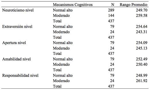 En la Tabla 1 se puede verificar el análisis de la relación entre ambos grupos al nivel de los rasgos de personalidad y los mecanismos cognitivos, comparados los grupos experimental y de control. En cada rasgo de personalidad del Big Five Factor se puede verificar el nivel del estado de los mecanismos cognitivos, considerando el nivel normal alto y moderado.