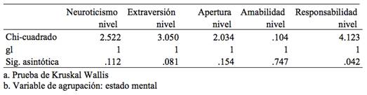 Se realizó una prueba para encontrar diferencias entre los entre los productos de los procesos cognitivos y los rasgos de personalidad según el NEO-FFI, filtrando aquellas personas que presentaban algún tipo de depresión medido por el BDI-II, encontrando diferencias estadísticamente significativas con la prueba de Kruskal Wallis entre el rasgo de responsabilidad (p=.042) y un nivel moderado de deterioro. Tabla 2