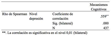El análisis de los resultados se realizó en el programa Statistical Package for the Social Sciences (SPSS) en su versión número 22 para sistema Windows 7. Las pruebas estadísticas usadas fueron el coeficiente de correlación de Spearman con el 95% de confianza, a su vez para contrastar las diferencias entre los distintos niveles de depresión y mecanismos cognitivos se realizó la prueba no paramétrica de Kruskal Wallis.