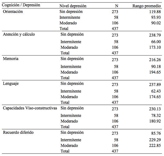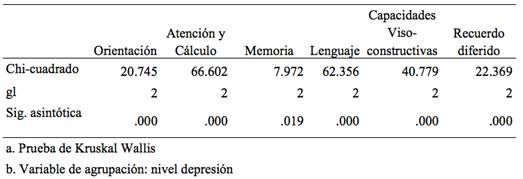Para contrastar diferencias entre los niveles de depresión medidos por el BDI-II; se realizó una prueba de Kruskal Wallis. Los resultados muestran la existencia de diferencias estadísticamente significativas entre las tareas de orientación (p=.00), atención y cálculo (p=.000), lenguaje (p=.000), memoria (p=.019), capacidades viso-constructivas (p=.000) y recuerdo diferido (p=.000).