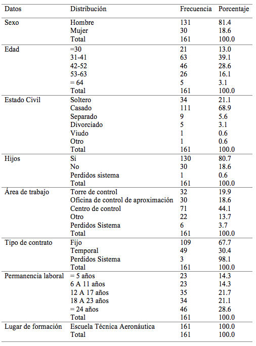 La muestra estuvo compuesta por 161 CTA de entre 30 a 64 años de edad. La técnica de muestreo fue no probabilística y por conveniencia. La siguiente tabla recoge los datos sociodemográficos característicos de la muestra. Tabla 1