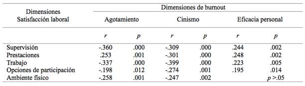 A mayor agotamiento menor satisfacción laboral y viceversa; y a mayor cinismo menor satisfacción laboral y viceversa. Ocurre lo contrario con la eficacia personal, mientras mayor es la satisfacción laboral también será mayor la eficacia personal y viceversa (Tabla 10).
