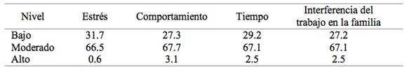 En la Tabla 6 se muestra el nivel de conflicto trabajo-familia con base a sus dimensiones y las dos direcciones en las que se da: conflicto de trabajo hacia la familia y de la familia al trabajo. En general, reportaron moderados niveles de conflicto en el estrés asociado a cada rol, en los comportamientos y en las demandas temporales, al igual que con el grado de interferencia del trabajo en la dinámica familiar.