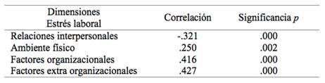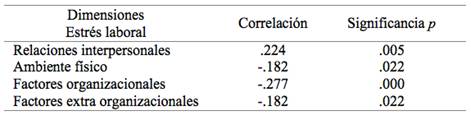 Además, se encontró que en la medida que se identifican a los factores organizacionales y a los extra organizacionales como desencadenantes del estrés, también aumenta la percepción de mayor conflicto trabajo-familia (r= .397; p=.000 y r= .604; p=.000, respectivamente).