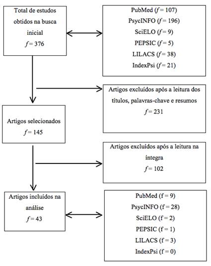 A busca inicial resultou no total de 376 publicações. Após aplicação dos critérios de inclusão/exclusão a partir dos títulos, palavras-chave e resumos e posterior leitura completa dos artigos, foram selecionados 43 estudos, conforme mostra a Figura 1.
