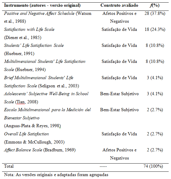 Foram mais frequentes os estudos que utilizaram material de coleta de dados em formato lápis e papel (f = 39), seguidos da entrevista (f = 2), grupo focal (f = 1) e misto (f = 1). Quanto aos instrumentos, teve-se uma variedade de 22 deles (ver tabela 1). Tal diversidade revela a preocupação no uso de instrumentos que consideram as especificidades de faixa etária e cultura da população investigada. Por exemplo, instrumentos adaptados para população sérvia (Positive and Negative Affect Schedule-X - SIABPANAS; Novovi & Mihi, 2008) e adolescente (Escala de Afetos Positivos e Negativos para Adolescentes - EAPNA; Segabinazi et al., 2012). Conforme mostra a tabela 1, a maior parte dos instrumentos foi desenvolvida para mensuração da satisfação de vida. Esse achado relaciona-se com a complexidade do conceito de satisfação de vida que varia na avaliação tanto da vida global quanto de dimensões específicas (família, escola, etc.). Contudo, dezessete publicações utilizaram escalas construídas em estudos com a população adulta sem reportar adaptações para o contexto infanto-juvenil, evidenciando que nesses estudos a mensuração do BES de crianças/adolescentes pode ter sido realizada na perspectiva dos adultos. Tabela 1