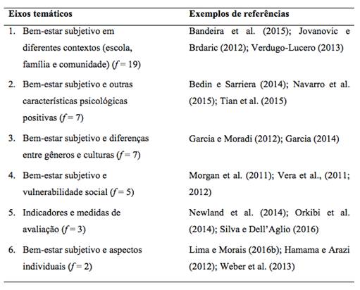 As publicações analisadas qualitativamente foram classificadas em seis eixos temáticos (ver Tabela 2), nos quais se destacaram os principais temas e resultados abordados nos estudos, contribuindo com dicussões relacionadas à avaliação psicológica, aos determinantes do BES, além da relação deste com os demais características psicológicas positivas.