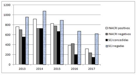 Desde Febrero de 2013 a Diciembre de 2017, la S.C.J. otorgó 2296 libertades anticipadas, habiendo un total de 3179 recomendaciones favorables y 2863 desfavorables por parte de I.NA.CRI. No se corresponden en el periodo la cantidad de evaluaciones realizadas con la cantidad de resoluciones que expide la S.C.J, posiblemente por un desfasaje en el tiempo de trámite, lo cual supone una debilidad al momento de analizar la correlación entre los datos. Tratándose de una resolución que implica el acceso del sujeto a su libertad ambulatoria de forma anticipada al cumplimiento del total de su pena, considerándose las diferentes repercusiones que ello tiene (fundamentalmente respecto a los delitos más violentos), y que en la mayoría de casos (exceptuando 2017) respecto a la totalidad de informes positivos, se ha fallado a favor de la misma, se valora de especial relevancia la calidad científica de las pericias que estarán siendo de valor probatorio para la S.C.J.