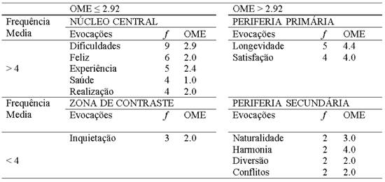 Vale ressaltar os elementos “naturalidade”, “harmonia”, “diversão” e “conflitos”, todos periféricos. Desse modo, envelhecer, para os participantes dessa pesquisa, está mais próximo de “um período de dificuldades, porém feliz” que de “processo natural e harmonioso”.