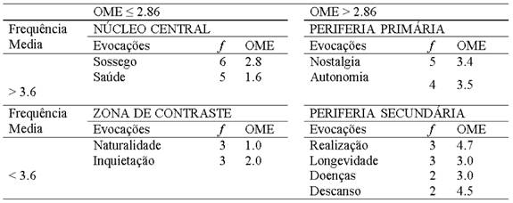 O último quadrante, composto por “realização”, “longevidade”, “doenças” e “descanso”, permitiu variações pessoais, sem alteração do núcleo, servindo como prescritor de comportamentos e sendo a parte operacional da representação.