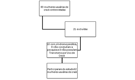 Foram adotados os seguintes critérios de inclusão: mulheres com idade entre 18 e 59 anos, com os critérios diagnósticos do DSM-5 (APA, 2014) para Transtorno Relacionado ao Uso de Crack, abstinentes há pelo menos sete dias, entre o sétimo e o décimo quinto dia de internação hospitalar. A escolha por tal período de tempo deu-se a fim de delimitar o tempo de tratamento (Kopetz et al., 2014). O uso simultâneo de outras drogas poderia ocorrer, desde que o crack fosse a droga que motivou a procura pela internação.