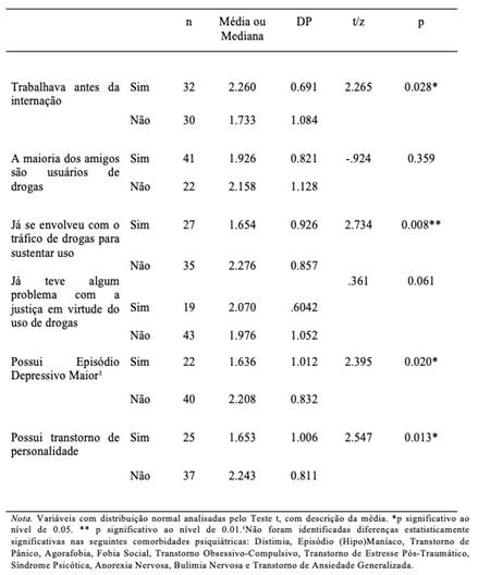 Posteriormente, ao comparar as características sociodemográficas, clínicas e relacionadas ao uso de drogas na pontuação do autocontrole da agressividade, identificou-se menores escores no autocontrole da agressividade em mulheres com as seguintes características: que não trabalhavam antes da internação, possuíam envolvimento com o tráfico de drogas para sustentar o uso, possuíam Episódio Depressivo Maior e possuíam Transtorno de Personalidade, conforme pode ser observado na Tabela 1.
