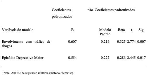 As variáveis que apresentaram diferenças estatisticamente significativas na Tabela 1 foram submetidas em uma análise de regressão múltipla (método Stepwise), que identificou que o envolvimento com o tráfico de drogas e o Episódio Depressivo Maior mostraram-se preditores dos baixos escores no autocontrole da agressividade, conforme pode ser observado na Tabela 2. Tal procedimento forneceu um coeficiente de variância explicada (R2) de 0.193, o que determina que as variáveis independentes selecionadas explicaram 19.3% dos baixos escores no autocontrole da agressividade. As variáveis “possuir transtorno de personalidade” e “trabalhar antes da internação” não foram estatisticamente significativas, ou seja, não forneceram um poder explicativo para o autocontrole da agressividade nas participantes deste estudo.