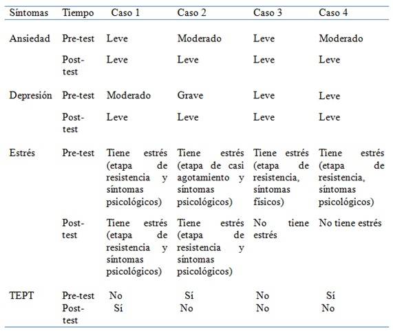 Los síntomas de estrés presentaron reducción en los casos 2, 3 y 4 y se mantuvieron estables en el caso 1. Por fin, criterios diagnósticos para TEPT observados en el pre-test en los casos 2 y 4 no fueron identificados en el post-test. Por otro lado, en el caso 1 se observó que hubo el diagnóstico de TEPT después de la intervención.