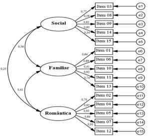 Gostaria de ter um relacionamento amoroso mais satisfatório). A consistência interna, avaliada pelo coeficiente alfa de Cronbach (α), foi satisfatória: social (α= 0.90), familiar (α= 0.89) e romântica (α= 0.87). Ademais, quatro itens apresentam pontuações invertidas, a saber: 1, 3, 7 e 14.
