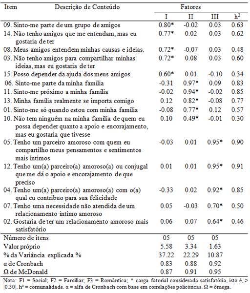 Inicialmente, foi realizada uma análise fatorial exploratória, tendo como finalidade conhecer a estrutura fatorial da matriz de correlações policóricas entre os 15 itens da SELSA. Verificou-se a adequação da amostra por meio do índice de Kaiser-Meyer-Olkin (KMO = 0.85) e o teste de esfericidade de Bartlett, χ²(105) = 3404.8; p < 0.001. O método Hull sugeriu uma solução trifatorial, explicando conjuntamente 70.38% da variância total, tendo o fator social explicado 37.22%, seguido do familiar (22.29%) e do romântico (10.87%). Foi realizada uma rotação Promin, adotando-se como critério de saturação das cargas fatoriais valores iguais ou superiores a |0.50|. Os dados podem ser observados na Tabela 1.